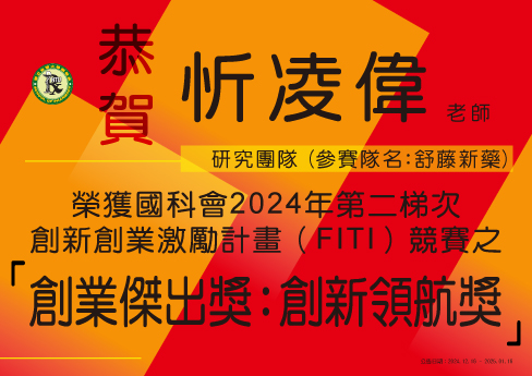 【恭賀】忻凌偉老師研究團隊(參賽隊名:舒藤新藥),榮獲國科會2024年第二梯次創新創業激勵計畫(FITI)競賽之「創業傑出獎:創新領航獎」