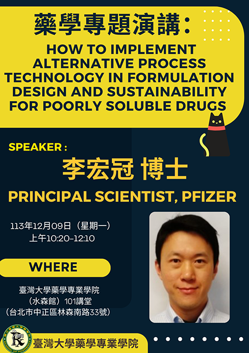 【藥學專題演講】How to Implement Alternative Process Technology in Formulation Design and Sustainability for Poorly Soluble Drugs|李宏冠博士/ Principal Scientist (Pfizer)