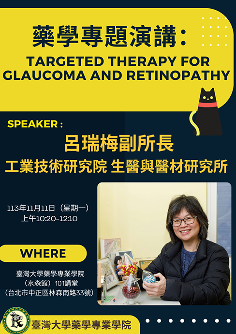 【藥學專題演講】Targeted Therapy for Glaucoma and Retinopathy|呂瑞梅副所長(工業技術研究院 生醫與醫材研究所)