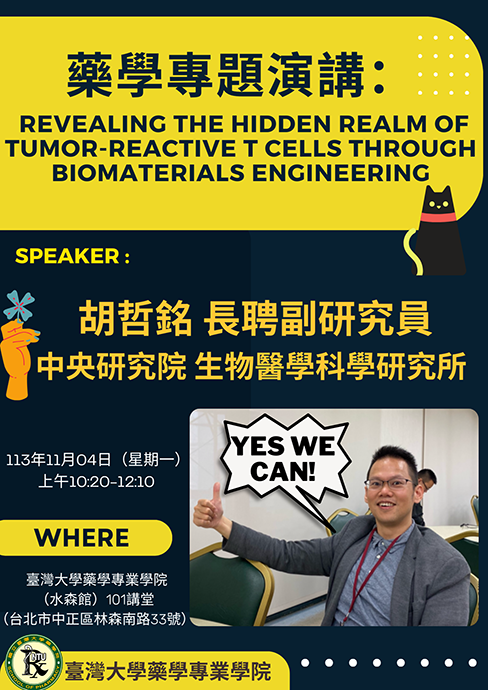【藥學專題演講】Revealing the Hidden Realm of Tumor-Reactive T Cells Through Biomaterials Engineering|胡哲銘長聘副研究員(中央研究院 生物醫學科學研究所)