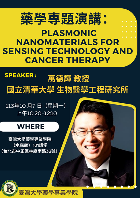 萬德輝教授(國立清華大學 生物醫學工程研究所) 講題: Plasmonic Nanomaterials for Sensing Technology and Cancer Therapy 講者:萬德輝教授 國立清華大學 生物醫學工程研究所 演講時間:113 年 10月 7 日 (星期一) 10:20~12:10 演講地點:臺灣大學藥學專業學院(水森館) 101講堂