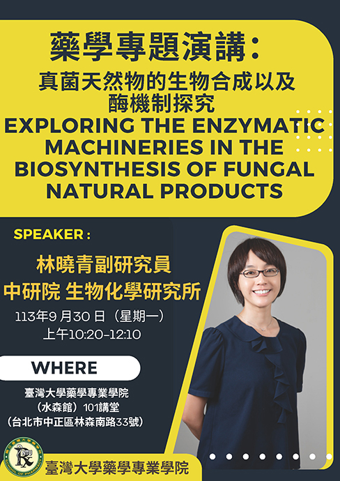 【藥學專題演講】真菌天然物的生物合成以及酶機制探究Exploring the Enzymatic Machineries in the Biosynthesis of Fungal Natural Products|林曉青副研究員(中研院生物化學研究所)