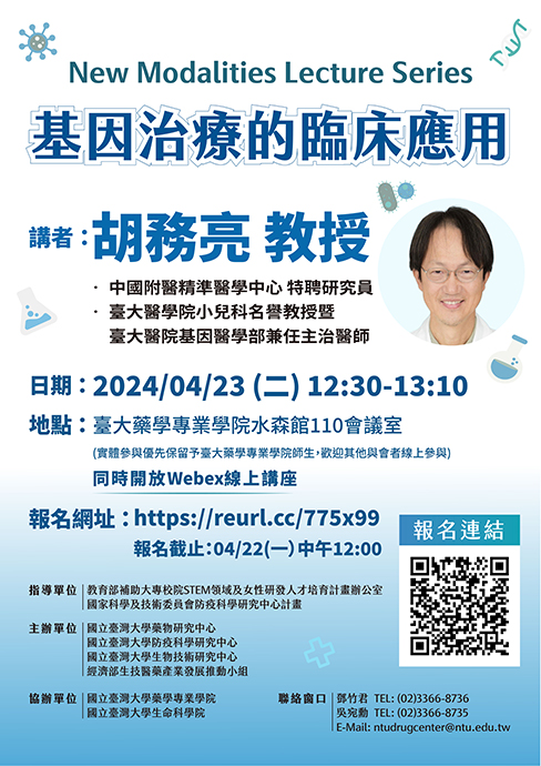 讓我們一同期待胡務亮教授分享基因治療藥物開發與其臨床應用的精彩歷程!
