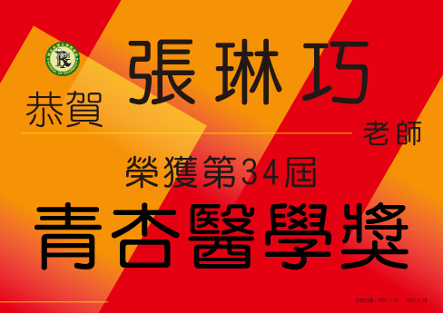 【恭賀】張琳巧老師榮獲第34屆青杏醫學獎