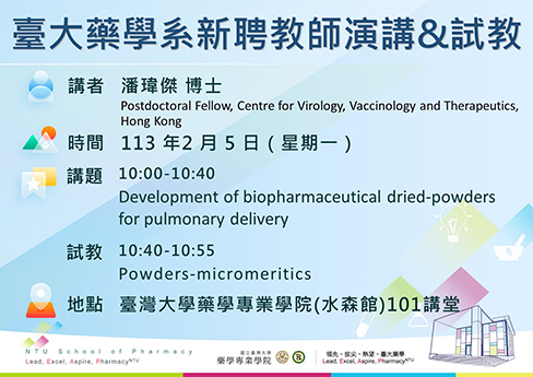 【藥學系新聘教師演講、試教】Development of biopharmaceutical dried-powders for pulmonary delivery