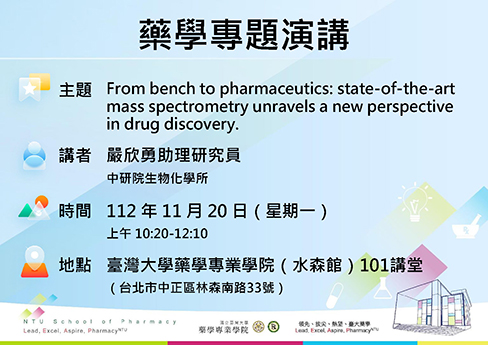 【藥學專題講座】From bench to pharmaceutics: state-of-the-art mass spectrometry unravels a new perspective in drug discovery|嚴欣勇助理研究員(中研院生物化學所)