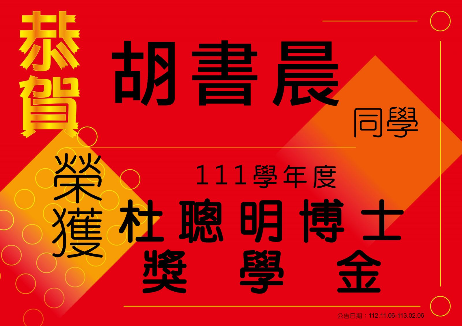 【恭賀】胡書晨同學榮獲111學年度杜聰明博士獎學金