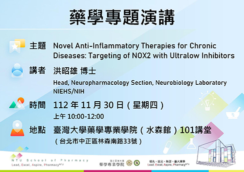 【藥學專題講座】Novel Anti-Inflammatory Therapies for Chronic Diseases: Targeting of NOX2 with Ultralow Inhibitors|洪昭雄博士(Head, Neuropharmacology Section, Neurobiology Laboratory, NIEHS/NIH)