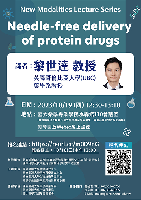【New Modalities(新模態藥物)午間系列講座 — 蛋白質藥物】—「Needle-free delivery of protein drugs 」