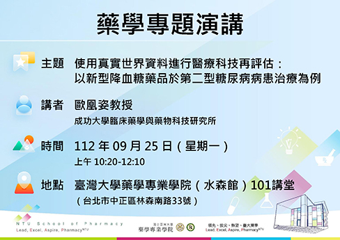 【藥學專題講座】使用真實世界資料進行醫療科技再評估:以新型降血糖藥品於第二型糖尿病病患治療為例|歐凰姿教授