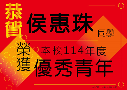 【恭賀】侯惠珠同學榮獲本校114年度優秀青年
