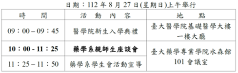 112學年度藥學系學士班親師生座談會將於8月27日(星期日)舉行,當日流程如下表: