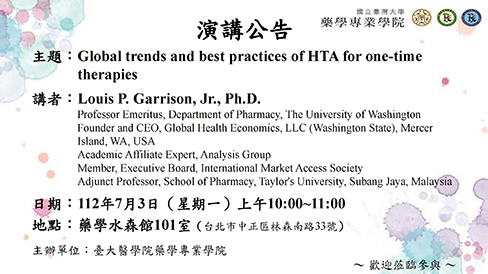【演講公告】Global trends and best practices of HTA for one-time therapies|Louis P. Garrison, Jr., Ph.D.