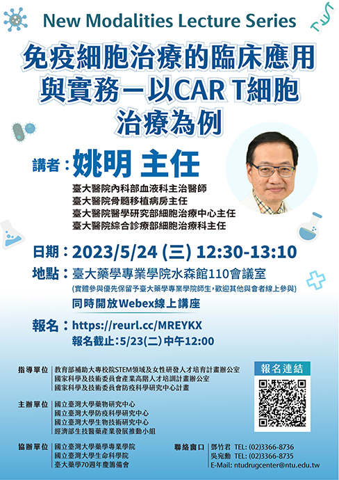 【New Modalities(新模態藥物)午間系列講座 — 細胞治療】—「免疫細胞治療的臨床應用與實務-以CAR T細胞治療為例 」
