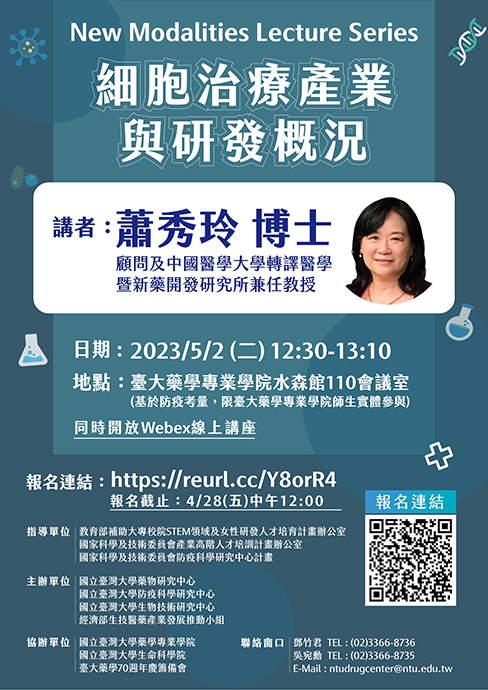 本系列第三場講座邀請到本校藥研所校友蕭秀玲博士蒞臨演講,她先後曾於Sanofi、Johnson & Johnson、Novartis等國際大藥廠,參與新藥研發臨床前後至上市後的核心領導決策團隊,回國後帶領長聖生技公司創建並通過美台細胞製劑之IND申請,三年多成功興櫃及上櫃,之後曾任向榮生技策略長,現為獨立顧問。本次講座將以其豐富多年的業界研發經驗,帶領我們瞭解細胞治療產業與研發概況: