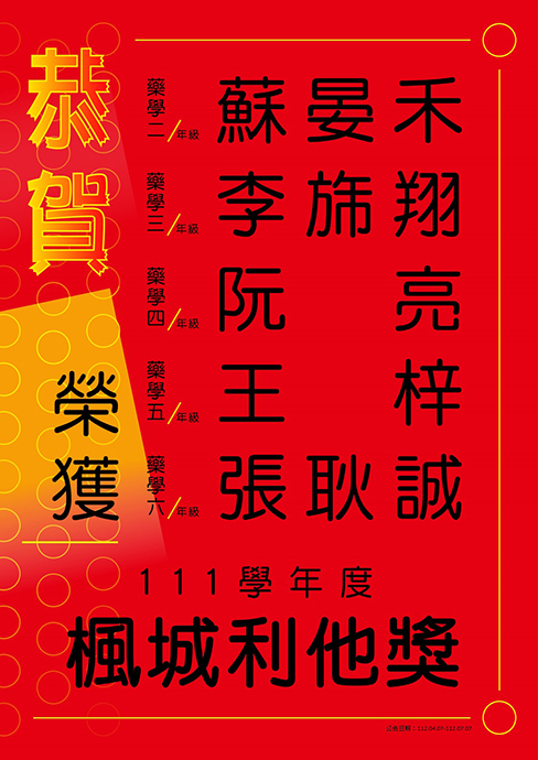 【恭賀】榮獲111學年度楓城利他獎 藥學系二年級 蘇晏禾同學 藥學系三年級 李旆翔同學 藥學系四年級 阮 亮同學 藥學系五年級 王 梓同學 藥學系六年級 張耿誠同學