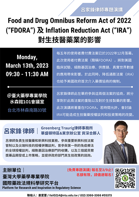 臺大藥學專業學院「國際藥政法規科學研究平台」誠摯邀請您踴躍參與「呂家鋒律師專題演講:Food and Drug Omnibus Reform Act of 2022 (“FDORA”) 及 Inflation Reduction Act (“IRA”) 對生技醫藥業的影響」!敬請於2023年3月9日 (四) 23:59 前完成報名:https://forms.gle/PbuPUrUz3ktHVhCp9
