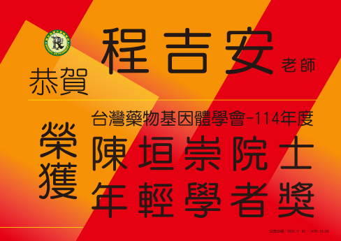 【恭賀】程吉安老師榮獲台灣藥物基因體學會-114年度陳垣崇院士年輕學者獎