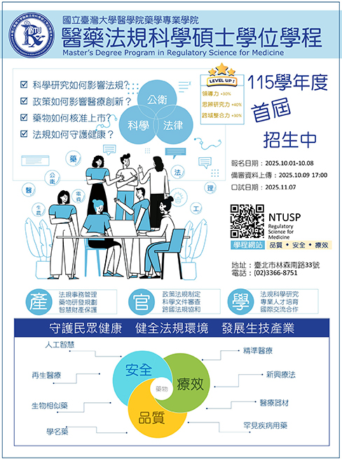 115學年度「醫藥法規科學碩士學位學程」首度招生中