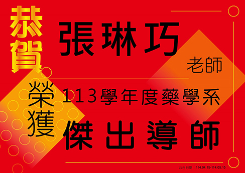 【恭賀】張琳巧老師榮獲113學年度藥學系傑出導師