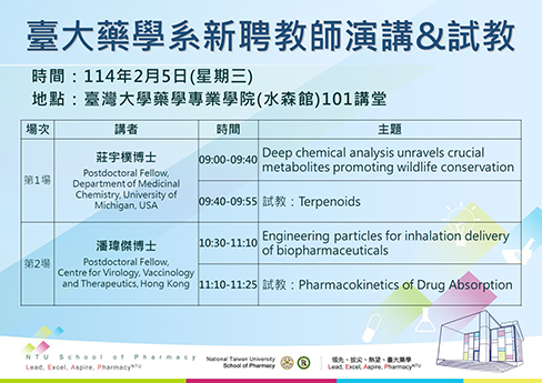 【演講通知】藥學系新聘教師演講與試教(2/5 09:00-11:30,水森101室)