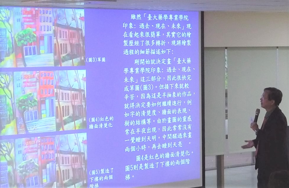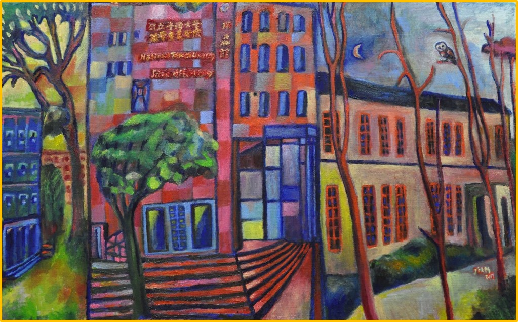 The former building of the Department of Pharmacy was located in the College of Medicine, which was a two-story ancient building, classic and elegant. On the right-hand side of the painting is the building depicted by my husband, Prof. Tien-Chun Chang, using a semi-abstract means of artistic expression. The mottled walls and lattice windows spell out so many stories. My husband once cleaned the labwarefor me here, which is also an anecdote. The lush green trees in front of the building were replaced by the withered branches, which implies the perseverance and persistence of our school in safeguarding health. In the center of the painting is the new site for the School of Pharmacy, Shui-Sen Hall, with colorful glass windows. On the left-hand side of the painting is the prospective expansion. My husband enjoys decorating his painting with the moon and the owl, which gives a crucial touch to the picture.