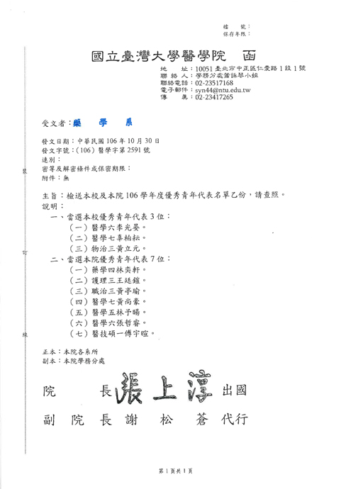 Congratulations! The senior student Yi-Hsuan Lin was elected the 106 academic year Excellent youth of College of Medicine