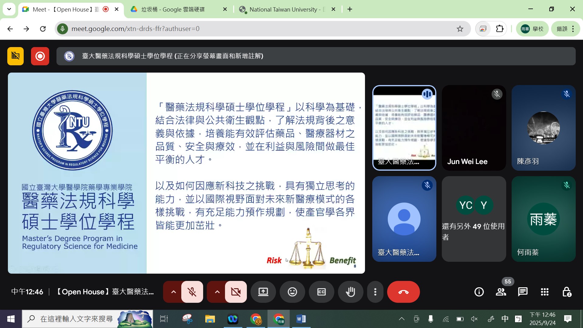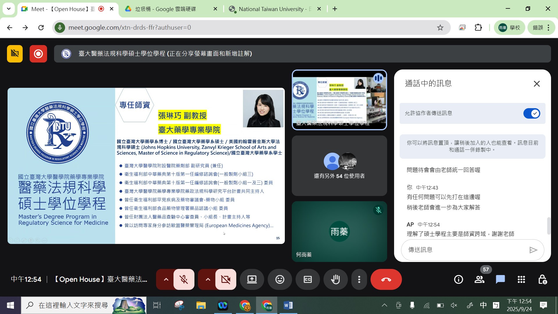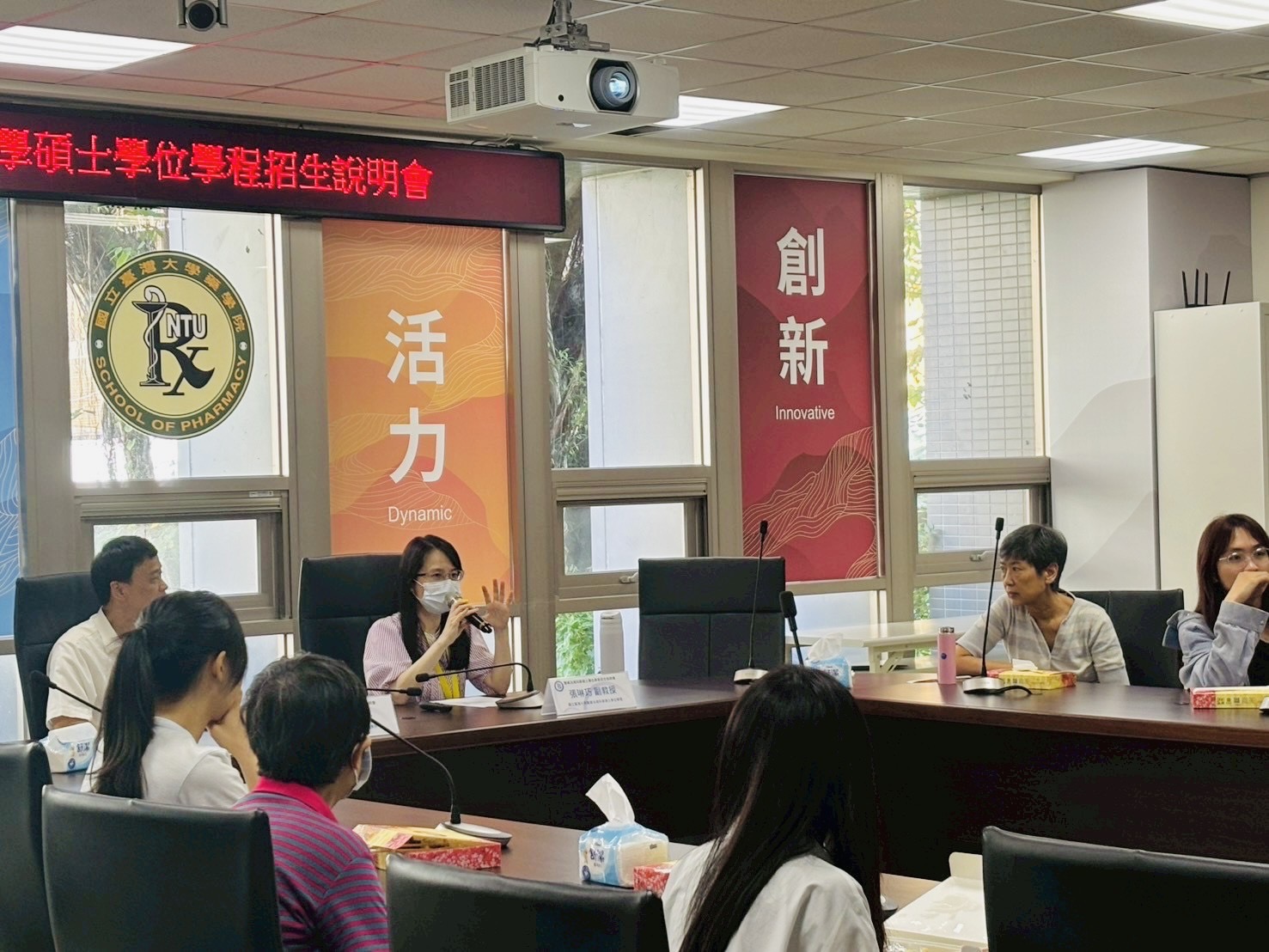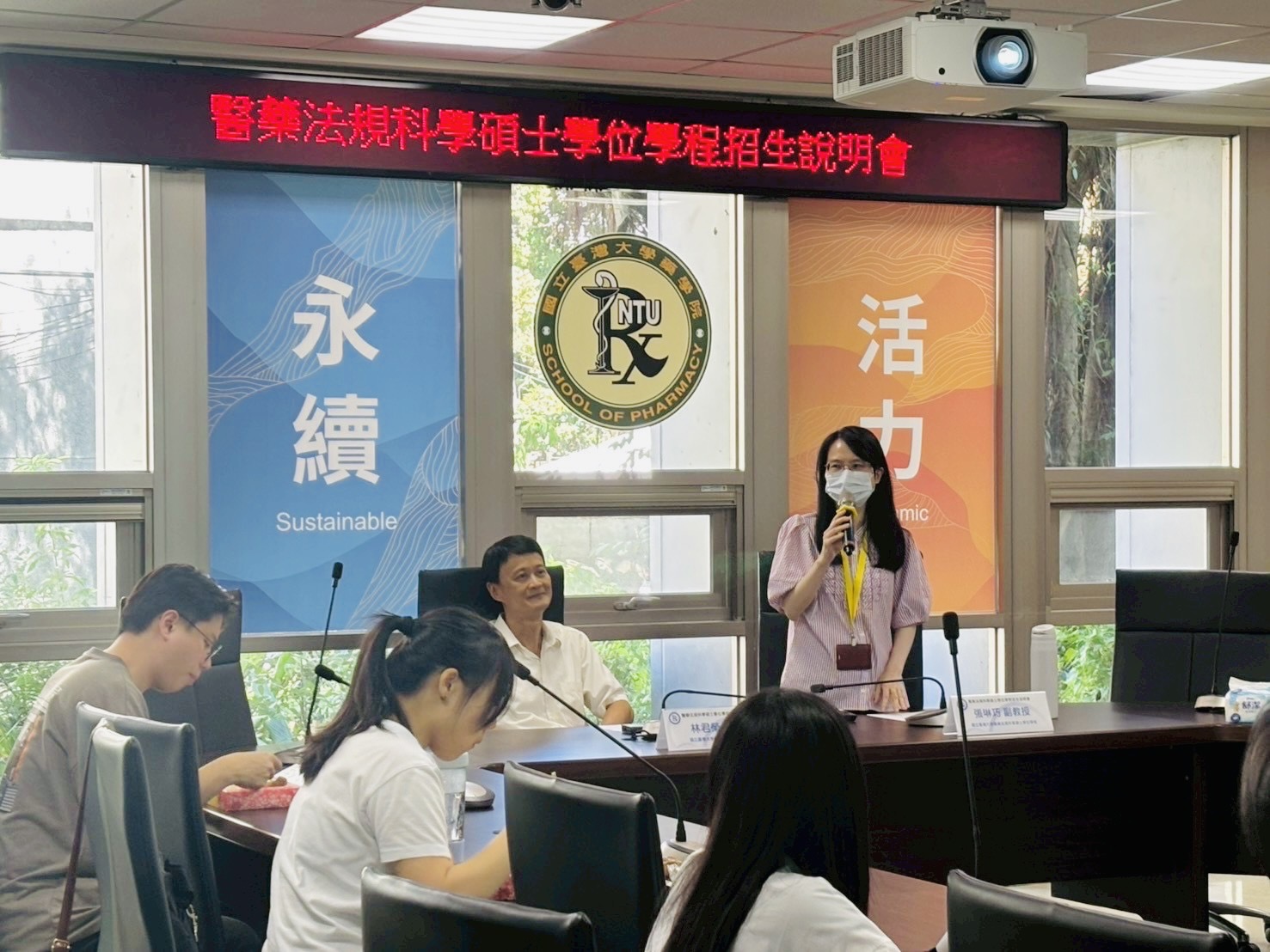 招生說明會於當日中午12時30分準時開始,由臺大藥學專業學院林君榮院長致歡迎詞揭開序幕,對現場及線上共約80位的與會者表示誠摯歡迎。接著由張琳巧副教授詳細介紹本學程的創立起源、課程設計、師資陣容與職涯發展,以及本次碩士甄試及後續招生考試等相關事宜。